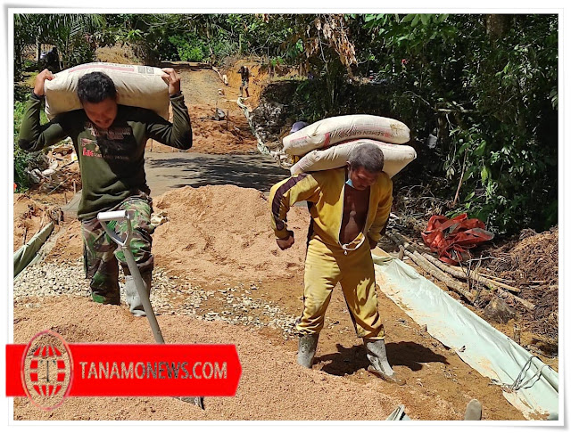 TANAMONEWS - BENGKAYANG | Keterbatasan alat dan keberadaan material bangunan berupa semen yang cukup jauh dari titik pengecoran jalan usaha tani, disiati oleh Satgas TMMD ke 111 Kodim 1202/Skw, bersama masyarakat desa dengan mengangkutnya dengan cara dipanggul atau dipikul hingga ke titik terdekat lokasi pengecoran.